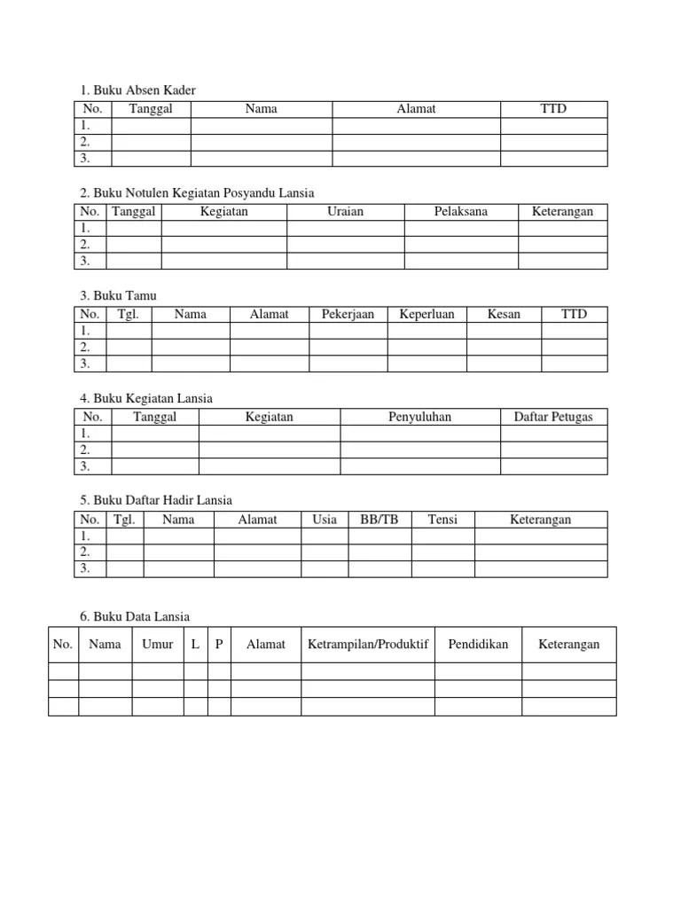 Contoh buku kegiatan posyandu lansia. Buku catatan kegiatan posyandu lansia pku bantarsari from dokumen.tips Demi terwujudnya peningkatan strata posyandu rahayu 1 yang semula purnama menjadi posyandu mandiri maka setelah kegiatan posyandu rahayu 1 (12/02/2020) dengan 5 mejanya yaitu pendaftaran, penimbangan, pencatatan, penyuluhan dan pelayanan. Contoh alat yang dipakai untuk posbindu posbindu kit alat ukur kadar gula darah pengukur tinggi badan pengukur lingkar perut tensi meter pengukur berat badan 4. Contoh buku tamu kegiatan pkk pembinaan administration tim penggerak pkk desa kecamatan sewon contoh surat pemberitahuan kegiatan karang taruna.