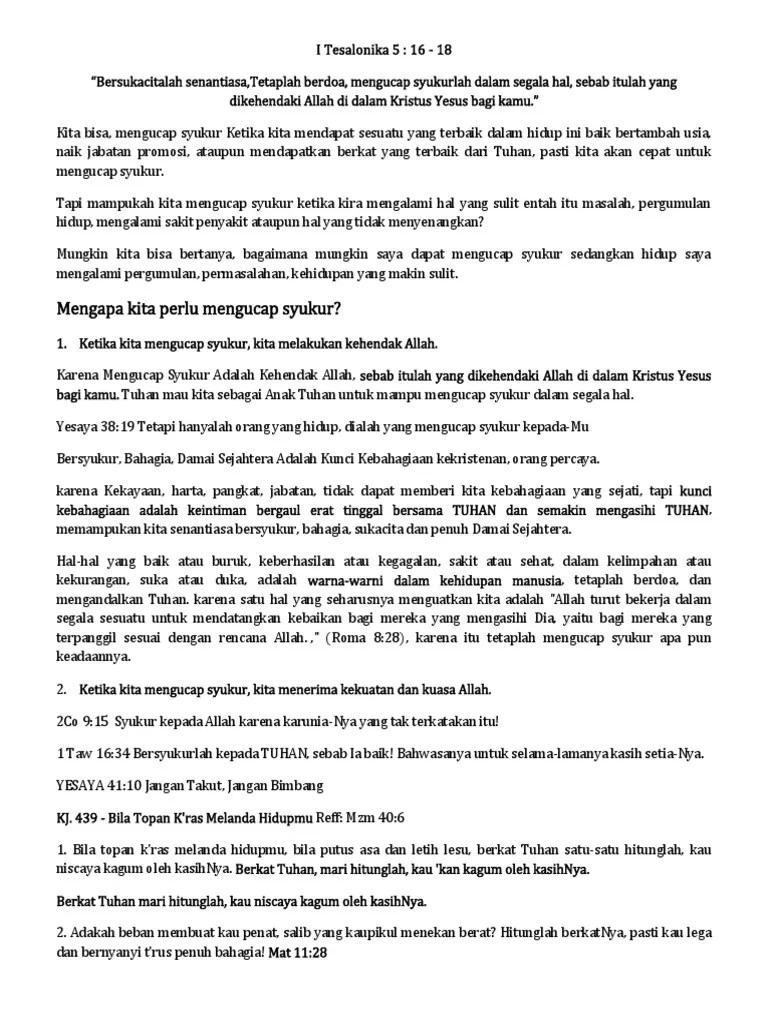 (5:18) mengucap syukurlah dalam segala hal, sebab itulah yang dikehendaki allah di dalam kristus yesus bagi kamu.